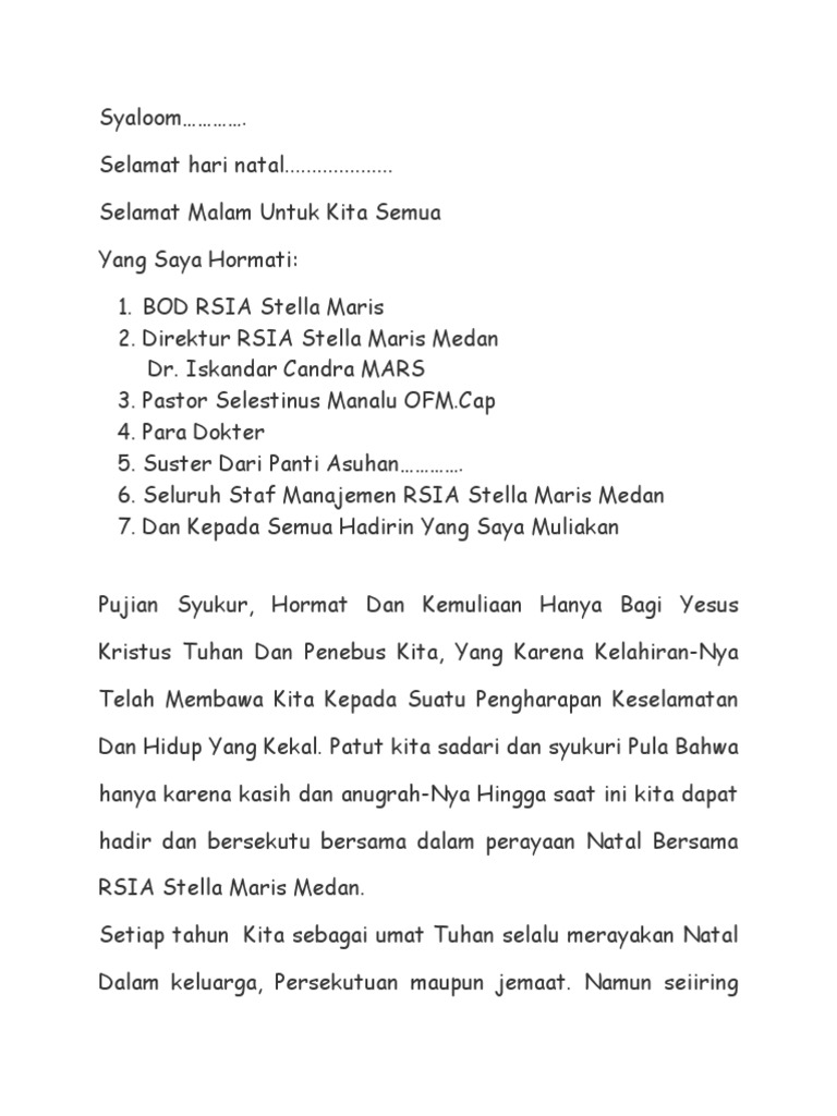 Kata sambutan ketua panitia natal sangat dibutuhkan dalam menyambut para hadirin karena ketua panitia harus menyampaikan sepatah dua patah kata dalam penyambutan. Dalam kata sambutan yang baik biasanya berisi penjelasan singkat mengenai latar belakang, tujuan, dan harapan acara tersebut terlaksana. Tata ibadah pra natal pemuda. Beberapa contoh kata sambutan sudah kita ketahui di beberapa artikel yang lalu. Kata sambutan ketua panitia natal. Kata sambutan adalah suatu kalimat atau kata kata yang disampaikan oleh seseorang sebagai ungkapan rasa syukur dan terimakasih atas kehadiran dan keterlibatan berbagai pihak dalam acara yang sedang berlangsung, kata sambutan biasanya disampaikan di awal acara dan durasinya pun. Sambutan ketua panitia natal bpk johny hutapea. Kata sambutan ketua panitia acara natal kata sambutan , kata sambutan panitia acara , keagamaan , natal , sekolah natal adalah hari raya umat kristen yang diperingati setiap tahun oleh umat kristiani pada tanggal 25 desember untuk memperingati hari kelahiran yesus kristus. Contoh pidato kata sambutan natal dan tahun baru #2. Akhirnya, kami atas nama panitia mengucapkan selamat natal tanggal 25 desember 2014 dan tahun baru 1 januari 2014. Syalom bagi kita semua, tanpa terasa kita sudah ada di penghujung tahun 2014. Majalahpendidikan.com akan menyampaikan materi pembelajaran dengan judul contoh kata sambutan. Banyak hal yang bisa disampaikan dalam kata sambutan tersebut.